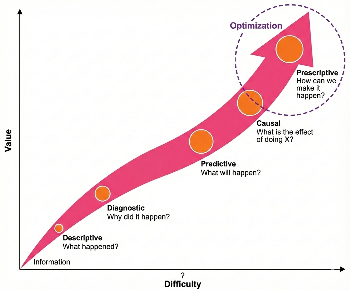 As we move from descriptive to diagnostic, predictive, causal, and finally prescriptive/optimization questions, the insights become more useful for real-world decisions, but also harder to answer. Harder questions often require more data, stronger assumptions, better models, and sometimes experiments or interventions to figure out cause and choose the best action.