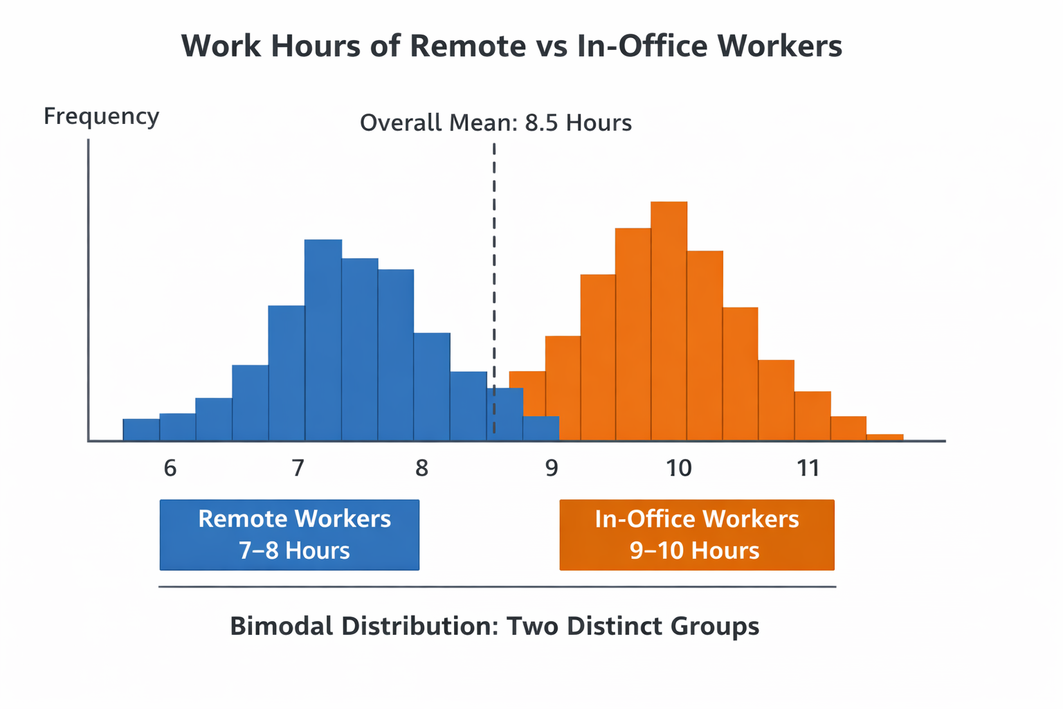 Although the overall mean may be around 8.5 hours, there is no single “typical” worker because the data contains two distinct populations.