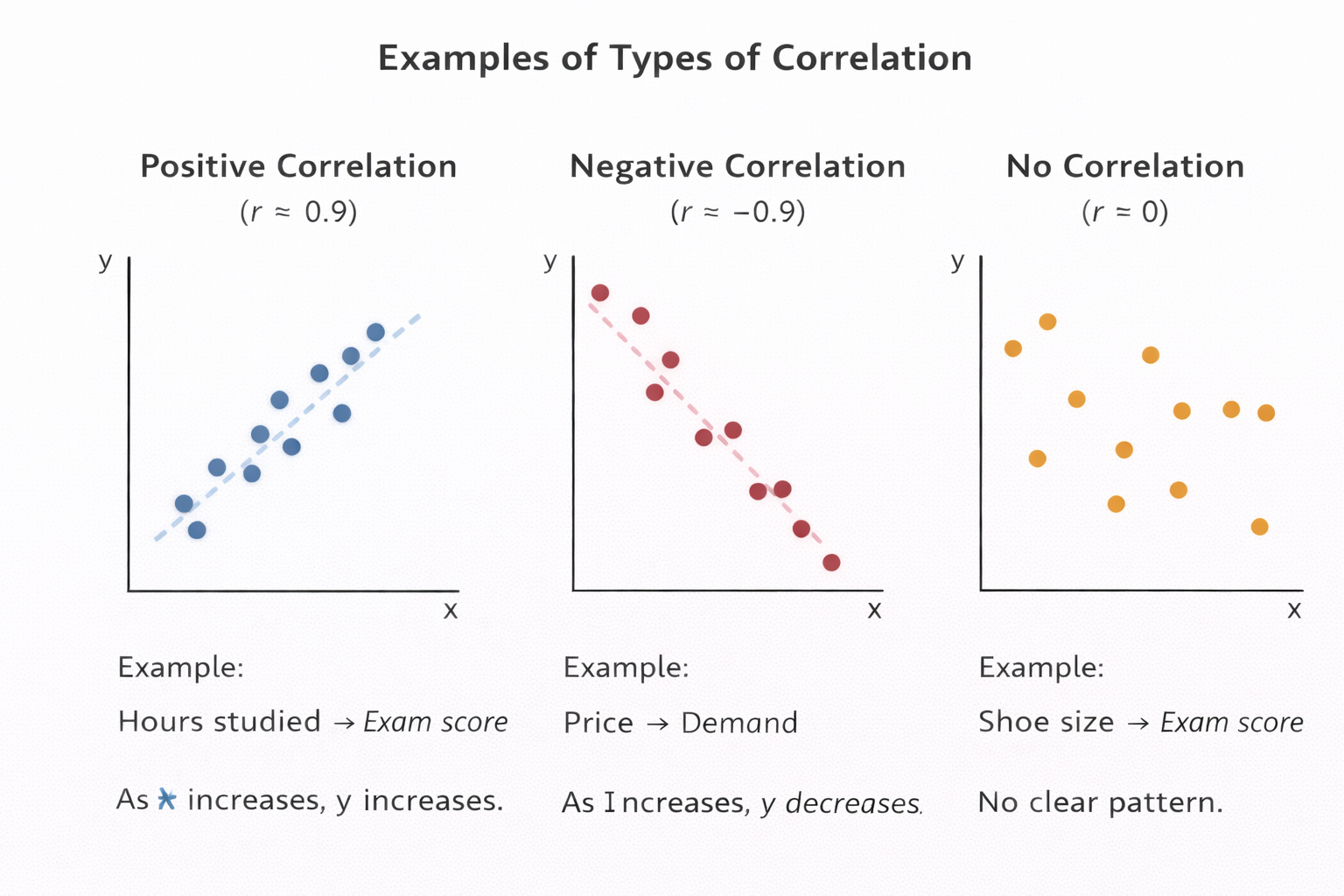 Positive: As x increases, y increases (e.g., study time and exam score)